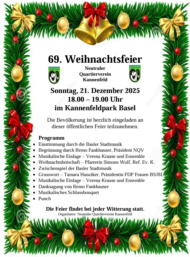 Aktuell Die Lindenapotheke bringt's! Gratis Heimlieferdienst Die Lindenapotheke am Bachgraben ist für Sie da.Schon gewusst? Wir bieten einen Gratis-Hauslieferdienst.News, hier lesen – PDF Aktuelles im Dezember 25 *** Weinachtsfeier Der Neutrale Quartierverein Kannenfeld ladet alle Bewohner von Basel ein, an der Weihnachtsfeier teilzunehmen.Sonntag, 21. Dezember 2025Ort: Rondel KannenfeldparkBeginn: 18.00 bis 19.00 UhrEs machen mit:Die Baseler StadtmusikVerena Krause und EnsemblePfarrerin Simone Wolf, Ref. Ev. KircheTamara Hunziker, Präsidentin FDP Frauen BS/BLAnlass: öffentlich Kanneflash 4. Q. 2025 Jahresprogramm Jahresprogramm ab September 25